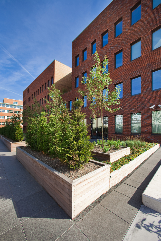 The entrance area displays the men's collection and feels like a men's chamber with oak parquet flooring and walls covered in sturdy black steel paneling. The chamber is furnished with black wooden tables, metallic clothing racks and a leather upholstery cash desk. All the premium brands are signed in brass panels hanging on the walls behind the cash desk. In the middle of the store a Denim Lab is created which focusses on premium jeans brands. This area has four large freestanding white clothing closets with white shelves and brackets. You feel surrounded by blue walls of denim like in a library. In contrast to the men's area the parquet floor is made of black steel and the walls are covered with fabric. In the middle of this room a wooden Denim Bar with drawers display the Vintage Jeans collection and accessories. This is the heart of the store where the customer can get serviced on this high-end product and can get a nice cup of coffee. The woman's collection is in the back of the store and this area looks more like a garden room. The white wooden tables, big mirrors, champagne coloured clothing racks and light oak wooden paneling give this area a lighter and warmer ambiance. Large mirror doors conceal the fitting rooms and act like big windows looking out.